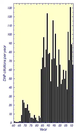 Numărul anual de citări ale lucrărilor lui D.N. Poenaru et al. arată creșterea bruscă din anul 1984 după ce Rose și Jones (Oxford University) au publicat prima confirmare experimentală a radioactivității 14C a 223Ra.