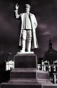 Statuia din ghips a lui Stalin a fost inaugurată la 7 noiembrie 1951, pe locul actualei troițe din fața Consiliului Județean, iar statuia din bronz a lui Stalin se înălța pe locul actualului Cimitir al Eroilor.[12]