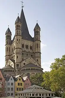 Ca sediu al Arhiepiscopiei de Köln încă din secolul al VII-lea, orașul Köln se mândrește cu un număr mare de biserici medievale, atât în stil romanic, cât și gotic. Stilul romanic este deosebit de bine reprezentat. Cea mai remarcabilă biserică romanică a fost înlocuită în 1248 cu actuala catedrală gotică (Kölner Dom); era catedrala carolingiană (Alter Dom) cu două coruri, două transepte, două turnuri-lanternă, masiv vestic[1], culoare și un plan treflat.