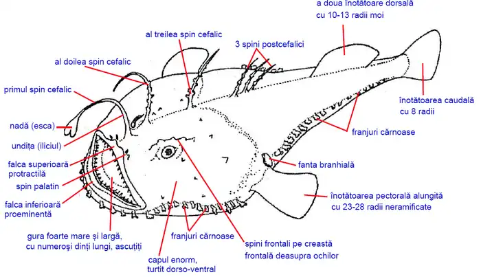 Corpul lui atinge o lungimea de 2 m și o greutate de 58 kg. Trăiește până la 20 de ani sau chiar mai mult. Are capul foarte mare, puternic turtit dorso-ventral și lățit. Gura este enormă și prevăzută cu numeroși dinți lungi, ascuțiți, înclinabili. Pielea este golașă (fără solzi), cu numeroase franjuri mici cărnoase în jurul fălcii inferioare și de-a lungul laturilor capului care se extind și pe laturile corpului. Are două înotătoare dorsale separate. Prima înotătoare dorsală este formată din 3 spini subțiri aflați pe cap (spini cefalici) și 3 spini în spatele capului (spini postcefalici). Primii doi spini cefalici se află la extremitatea anterioară a botului, primul dintre ei se găsește aproape de gură și este modificat într-un dispozitiv mobil de pescuit asemănător cu undița, numit iliciu (illicium - undița sau momeală), care are un apendice cărnos la vârf, numit nadă (esca). Esca servește ca momeală pentru atragerea prăzii în apropierea gurii sale enorme; de la acest dispozitiv de pescuit se trage numele de pește pescar. A doua înotătoare dorsală are 10-13 radii moi. Înotătoarele pectorale sunt alungite, în spatele lor se află fantele branhiale. Culoarea spatelui este brun-ciocolatie sau violacee, de multe ori marmorată cu pete, iar a abdomenului albă.[4][5][6][7][8] Aspectul exterior al masculilor și femelelor sunt identice, însă masculii sunt mai mici, astfel masculii maturi au în medie 49–58 cm, iar femelele 73–98 cm.[9][10]