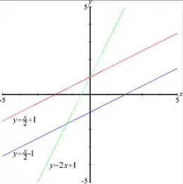 Dreptele dintr-un plan cartezian pot fi definite algebric prin ecuații liniare și funcții liniare. În cazul bi-dimensional, forma cea mai des utilizată este ecuația dreptei în care variabila dependentă (aici, y) este exprimată în "funcție de" variabila independentă (aici, x).