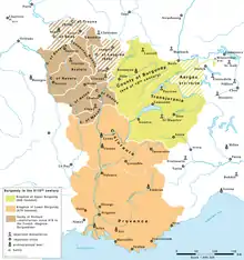 ![]() Ducatul Burgundia în Franța în jurul anilor 1477. Teritoriile bej sunt domeniile deținute de ducii de Burgundia Ducatul Burgundia în Franța în jurul anilor 1477. Teritoriile bej sunt domeniile deținute de ducii de Burgundia | |||||