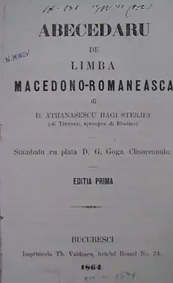 - Abecedaru de Limba Macedono-Romaneasca, București, 1864[15]