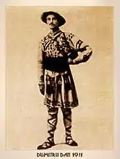 ![]() Globe-trotterul Dumitru Dan, în costum național, la 1911 | |