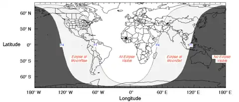 În situația în care cerul a fost senin, eclipsa a putut fi observată din cele două Americi, din Europa, din Africa și din cea mai mare parte a Asiei. Este eclipsa cu numărul 59 din seria Saros 114, având magnitudinea penumbrală de 0,9884.[1]