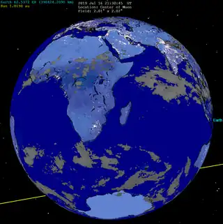 ![]() Pământul văzut de pe Lună în timpul maximului eclipsei. |
