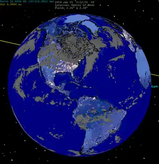![]() Terra văzută de pe Lună în timpul maximului eclipsei. |
