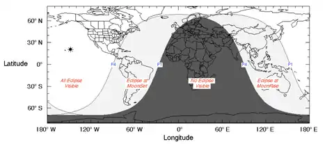 Eclipsa a putut fi observată în estul Asiei, în Oceania, în America de Nord și în America de Sud.