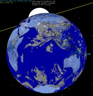 ![]() Pământul văzut de pe Lună, în timpul fazei maxime a eclipsei |