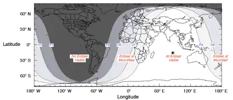 În condițiile unui cer senin, eclipsa a fost vizibilă în Europa de Est, Africa, Asia și Australia.