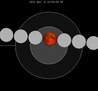 O eclipsă totală de Lună a avut loc pe 8 noiembrie 2022 (acum 1 an, 152 zile). Luna a trecut prin centrul umbrei Pământului. Eclipsa producâdu-se cu doar 5,8 zile înainte de apogeu (apogeul Lunii se va produce la 14 noiembrie 2022), diametrul aparent al Lunii va fi mai mic. Este a 20-a eclipsă din seria Saros 136, cu o magnitudine de 1,359.