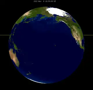 ![]() Pământul văzut de pe Lună atunci când eclipsa este maximă. ![]() |