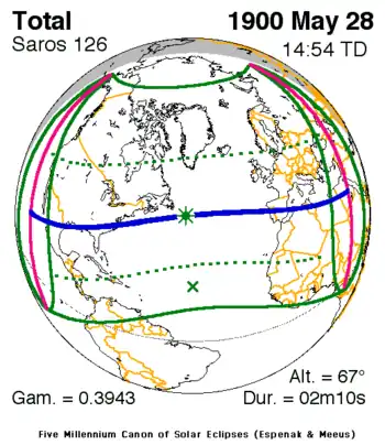 Eclipsa din 28 mai 1900 face parte din ciclul Saros 126, care se repetă o dată la 18 ani și 11 zile și conține 72 de evenimente. Seria a început cu eclipsa parțială de Soare din 10 martie 1179. Ea conține eclipse inelare din 4 iunie 1323 până la 4 aprilie 1810, eclipse hibride din 14 aprilie 1828 până la 6 mai 1864 și eclipse totale din 17 mai 1882 până la 23 august 2044. Seria se încheie la membrul 72 ca eclipsă parțială la 3 mai 2459. Cea mai lungă durată a unei eclipse centrale (inelară sau totală) a fost de 6 minute și 30 de secunde de inelaritate la 26 iunie 1359. Cea mai lungă durată a eclipsei totale a fost de 2 minute, 36 de secunde la 10 iulie 1972. Toate eclipsele din această serie se produc la nodul descendent al Lunii.