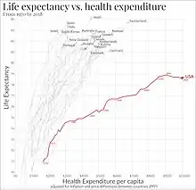 - Link between health spending and life expectancy: US is an outlier. May 26, 2017. By Max Roser(d) at Our World in Data(d). Click the sources tab under the chart for info on the countries, healthcare expenditures, and data sources. See the later version of the chart here.
