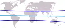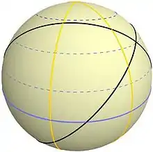 Ecuatorul (albastru) împarte sfera în 2 jumătăți egale și se intersectează la un unghi de 90° cu meridianul (în galben). Ecuatorul este prima și cea mai lungă paralelă geografică.
