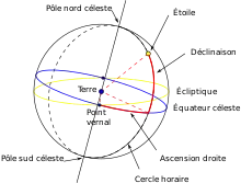 Din cauza înclinației axei Pământului, ecuatorul ceresc este înclinat cu 23° 26' în raport cu planul eclipticii. Ecuatorul ceresc înțeapă ecliptica în două puncte opuse, între care unul este punctul vernal sau punctul Gamma, iar celălalt este denumit uneori punctul Omega.