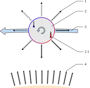 - Efect diurn: Asupra unui corp care se rotește iluminat de Soare (de exemplu, un asteroid sau Pământul), suprafața este încălzită de radiația solară în timpul zilei, și se răcește noaptea. Datorită proprietăților termice de suprafață, există un decalaj între absorbția de radiații de la Soare, și emisiile acelorași radiații drept căldură, astfel încât cel mai cald punct de pe o rotație a corpului apare în jurul valorii de "2 PM" pe suprafață, sau puțin după amiază. Aceasta rezultă într-o diferență între direcțiile de absorbție și de re-emisie de radiații, care produce o forță netă de-a lungul direcției de mișcare a orbitei. Dacă obiectul este un rotator prograd, forța este în direcția de mișcare a orbitei, și provoacă semi-axa majoră a orbitei să crească în mod constant spiralele obiectului departe de Soare. Un rotator retrograd face spirale spre interior. Efectul diurn este componenta dominantă pentru corpurile cu diametrul mai mare de 100 m.[2]
