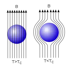 Diagramă a efectului Meissner. Liniile de câmp magnetic, reprezentate ca săgeţi, sunt excluse dintr-un superconductor atunci când temperatura lui scade sub temperatura critică, notată TC