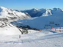 Teleschiul și pârtia de la Pas de la Casa cu Pic d'Envalira în fundal