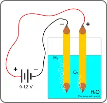 Două sârme, care vin de la bornele unei baterii, sunt plasate într-o ceașcă de apă cu o cantitate de electrolit pentru a stabili conductivitate în soluție. Folosind NaCl (sare de masă) într-o soluție de electrolit rezultă gaz de clor mai degrabă decât de oxigen din cauza unei jumătăți de reacție concurentă. Cu electrozii și electroliții corecți, cum ar fi bicarbonatul de sodiu (bicarbonat de sodiu), hidrogenul și oxigenul vor fi colectați la electrozii încărcați opus. Oxigenul se va colecta de la electrodul încărcat pozitiv (anod) și hidrogenul se va colecta de la electrodul încărcat negativ (catod). Rețineți că hidrogenul este încărcat pozitiv în H2O moleculă, astfel încât va ajunge la electrodul negativ. (Și vice-versa pentru oxigen.)