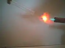 | Anod (oxidare): | 4 OH−(aq) | → | O2(g) + 2 H2O(l) + 4 e− |
