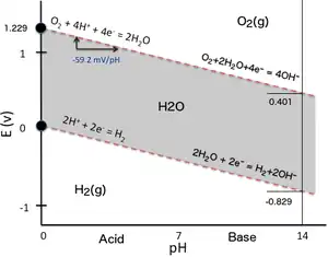 Aceeași jumătăți de reacții pot fi de asemenea, echilibrate cu bazele enumerate mai jos. Nu toate jumătățile de reacții trebuie să fie echilibrate cu acid sau cu baze. Multe o fac, cum este cea de oxidare sau reducere a apei prezentată aici. Pentru a adăuga jumătăți de reacții, ambele părți trebuie să fie echilibrate cu un acid sau cu o bază. Reacțiile echilibrate cu acid predomină în soluții acide (pH scăzut), în timp ce reacțiile echilibrate cu baze predomină în soluțiile bazice (pH ridicat).