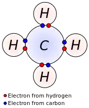 Patru legături covalente. Carbonul are patru electroni de valență și deci și valența egală cu patru, fiind tetravalent. Fiecare atom de hidrogen are un electron de valență, fiind univalent.