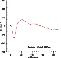 Un traseu este obținut, electroretinograma. Acest traseu permite să se analizeze răspunsurile scotopice și fotopice. Îndeosebi sunt studiați timpii de reacție și valorile electrice extreme.