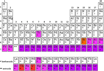Bismutul (Z= 83) este ultimul element stabil din sistemul periodic. Radioizotopi ai elementelor cu număr de ordine de la 84 până la 88 sunt produse în mod continuu în cadrul seriilor naturale de dezintegrare (alături de elementele actinide ușoare).