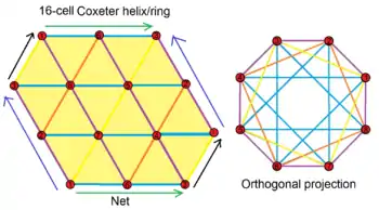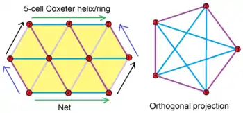 În plus, 16-celule se împarte în două inele de 8 tetraedre, lungi de patru laturi, iar 5-celule are un singur inel degenerat de 5 tetraedre.