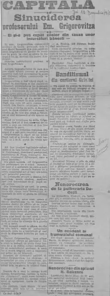- Articol de ziar: Sinuciderea profesorului Em. Grigorovitza, într-un ziar din 10 decembrie 1915.