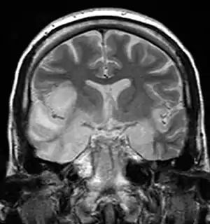 ![]() Imaginea scanată IRM arată un semnal ridicat în lobii temporali și girusul frontal inferior drept la cineva cu encefalită HSV. | |