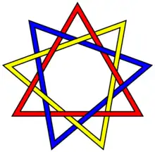 Există și un poligon stea, {9/3} sau 3{3}, făcută din punctele eneagonului regulat, dar conectată ca un compus de trei triunghiuri echilaterale.[4][5] (Dacă triunghiurile sunt întrețesute alternativ, rezultă o împletitură brunniană.) Această figură stelată este uneori cunoscută drept „steaua lui Goliath”, prin analogie cu {6/2} sau 2{3}, steaua lui David.[6]