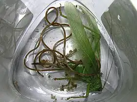 | Nematodul Mermis nigrescens parazit al cosaşului (Tettigonia viridissima) | |