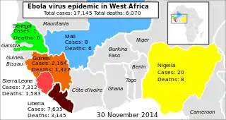 La data de 14 noiembrie 2014 se înregistra următoarea situație epidemiologică (a infectaților) în Africa de Vest, conform comunicatului CDC și OMS, bazată pe statisticile furnizate de ministerele de resort din țările afectate de epidemie[29]: