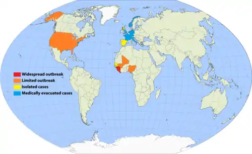 primul caz de Ebola a fost cel al unui preot adus din Sierra Leone ce a decedat pe 25 septembrie 2014, la Madrid. [34][35] - În Rwanda