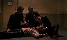 În camera de interogatoriu, BOB mărturisește - prin corpul lui Leland - că a ucis-o pe Laura Palmer și pe Maddy Ferguson. Când Cooper, Albert, șeriful Truman și Hawk se îndepărtează de ușă, BOB începe să cânte un poem care se termină cu expresia „foc, plimbă-te cu mine”.[6] Aspersoarele de apă se pornesc și BOB îl forțează pe Leland să comită sinucid, lovindu-se cu capul de ușa de oțel a camerei. BOB îi părăsește corpul, iar Leland, în ultimele sale momente, dezvăluie natura entității. Cooper îl consolează pe Leland, iar după câteva secunde, acesta moare.