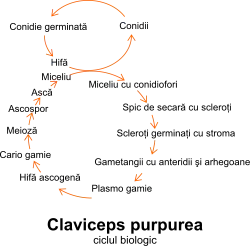 Ciclul de dezvoltare al speciei de ciupercă parazită Claviceps purpurea[24], începe în spicele de secară. Aici în locul unor boabe se formează formațiuni tari care sunt scleroții acestei ciuperci parazite. Acești scleroți sunt organe de rezistență ai ciupercii. De pe spicul de secară ei cad pe pământ. Fiind organe de rezistență, deci adaptați la condiții vitrege, aceștia rezistă până primăvara.
