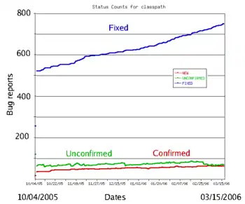 Istoria de erori tipică (datele proiectului GNU Classpath). O eroare nouă trimisă de utilizator e unconfirmed(neconfirmată). Odată ce a fost reprodusă de un dezvoltator, este eroare confirmed(confirmată). Erorile confirmate după aceasta sunt fixed(fixate). Erorile care aparțin altor categorii (nereproductibile, nu vor fi fixate, etc.) deseori sunt în minoritate