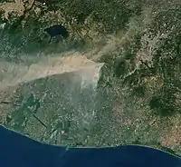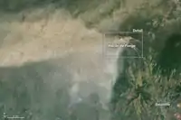 | 31 ianuarie | Vulcanul Fuego erupe pe 31 ianuarie. Landsat 8 obține o imagine a erupției o zi mai târziu. Potrivit CONRED, coloana de cenușă atinge înălțimea de 6.500 m și este transportată de vânt 40 km spre vest și sud-vest.[26] Cenușa afectează zeci de mii de oameni, în special în provinciile Escuintla și Chimaltenango.[26] Lava din două conducte active se scurge prin patru defileuri, forțând autoritățile să închidă preventiv drumul național 14.[26] | ![]() |