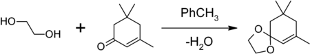Etilenglicolul este folosit în sinteza organică pentru a proteja grupe carbonil. Prin tratarea unei cetone sau unei aldehide cu etilenglicol în prezența unui catalizator (de exemplu, acidul p-toluensulfonic, sau trifluorura de brom cu dietileter) se obține 1,3-dioxolan, care este rezistent la acțiunea bazelor și a altor compuși nucleofili. Grupa protejată de 1,3-dioxolan poate fi eliminată, ulterior altor reacții, printr-o simplă hidroliză. [7] În exemplul de mai jos, compusul e protejat folosindu-se etilenglicol în prezența acidului p-toluensulfonic. Apa e eliminată prin distilare azeotropică, pentru deplasarea echilibrului chimic spre dreapta. [8]