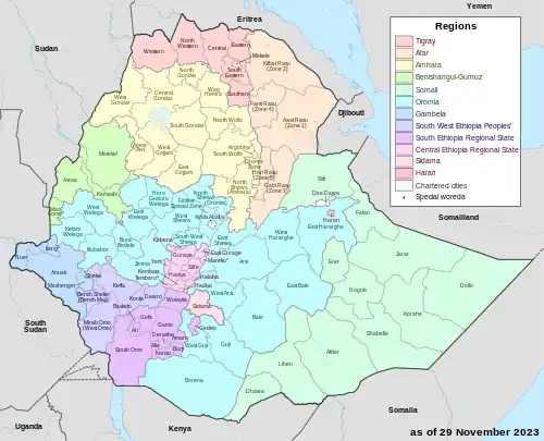 Din anul 1996, Etiopia este a fost împărțită în nouă state regionale etnice și autonome politic (kililoch, kilil singular) și două orașe state (astedader akababiwoch, singular astedader akababi), acestea din urmă sunt Addis Abeba și Dire Dawa (subdiviziunile 1 și 5 de pe hartă). Kililoch sunt împărțite în 68 de zone și mai departe în 550 de woredas și în mai multe woredas speciale.