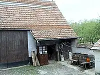 - Șura, cu unul sau două grajduri, în trecut unul din ele servea chiar de locuință, caz în care se numea „grăjduț”. Șura avea de asemenea componentele sale: aria, „șopru' ”, „feldăra” și „alașu' ”, „su' șopru' ”, „șopoteica”, „plesnicaru' ” și „coșaru' ” în care se păstra cucuruzul (porumbul) desfăcut de „foi”, precum și „polata” (cotețele pentru porci și păsări).