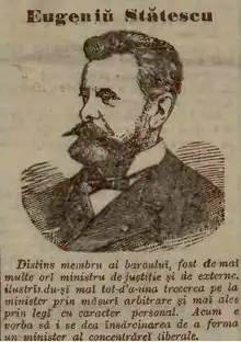 Eugeniu Stătescu a fost unul din membrii marcanți ai Partidului Național Liberal din a doua jumătate a secolului XIX, fiind membru fondator al partidului în 1875 și prieten și colaborator apropiat al lui Ion C. Brătianu. În perioada 1876-1903, Stătescu a fost de mai multe ori deputat, senator și ministru.[2]