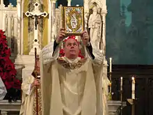 Preot ținând un evangheliar, cu Christos în mandorlă pe ferecătură