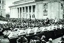 ![]() Un om fluturând drapelul lituanian în fața unui tanc sovietic, 13 ianuarie 1991 | |||||||