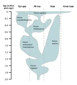 O perspectivă actuală asupra distribuției temporale și geografice a genurilor populațiilor Homo.[1] Alte interpretări diferă în principal în ceea ce privește taxonomia și distribuția geografică a speciilor de hominini.