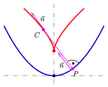 - Normalele curbei date în puncte de curbură diferită de zero sunt tangente la evolută, iar normalele curbei în punctele de curbură zero sunt asimptote ale evolutei. Prin urmare: evoluta este anvelopa normalelor curbei date.