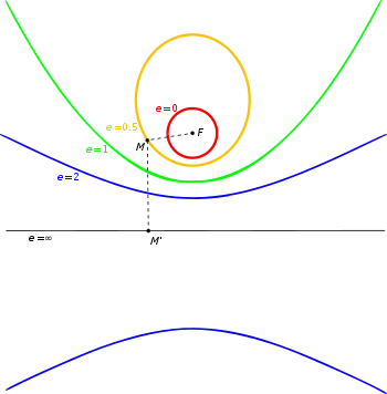 Orice secțiune conică poate fi definită ca locul geometric al punctelor ale căror distanțe până la un punct (focarul) și o dreaptă (directoarea) sunt într-un raport constant. Acest raport se numește excentricitate, notată în mod obișnuit cu e.