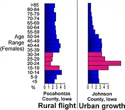 Exodul rural de după cel de-al-Doilea Război Mondial a fost cauzat în principal de răspândirea agriculturii industrializate . Fermele familiale mici, în care era nevoie de muncă intensă, au devenit sau au fost înlocuite cu ferme industriale puternic mecanizate și specializate. În timp ce o fermă familială mică produce de obicei o gamă largă de culturi, grădini și produse de origine animală - toate necesitând forță de muncă substanțială - fermele industriale mari se specializează de obicei în doar câteva culturi sau specii de animale, folosind utilaje mari și sisteme de izolare a animalelor care necesită o zecime din forța de muncă pe unitate produsă. De exemplu, Universitatea de Stat din Iowa raportează că numărul fermierilor de porci din Iowa a scăzut de la 65.000 în 1980 la 10.000 în 2002, în timp ce numărul de porci pe fermă a crescut de la 200 la 1.400. [7]